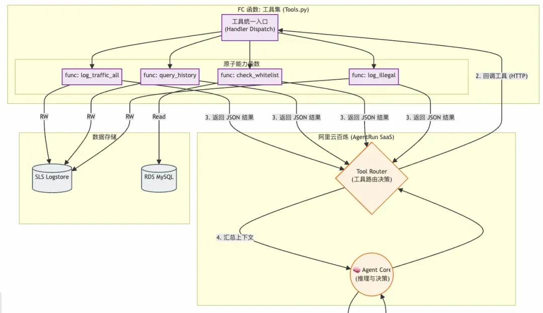 这两者是 1:1 完美映射的。我不需要在一个庞大的 Spring Boot 或 Django 项目里写一堆接口,我只需要写一个个独立、原子化的小函数:check_whitelist、log_to_sls。 Agent 想用哪个,就唤醒哪个。这种类微服务化的架构,让给 AI 增加新技能变得异常简单——写个新函数,一挂载,搞定。