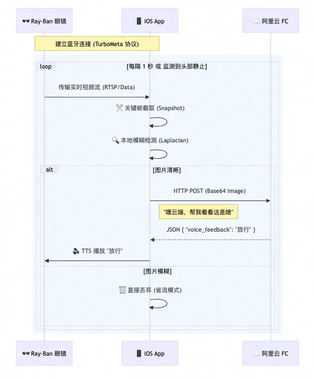 1.端 (Client):AI 眼镜 + iOS App。负责“抽帧”和“传图”,做一个无情的传输机器。