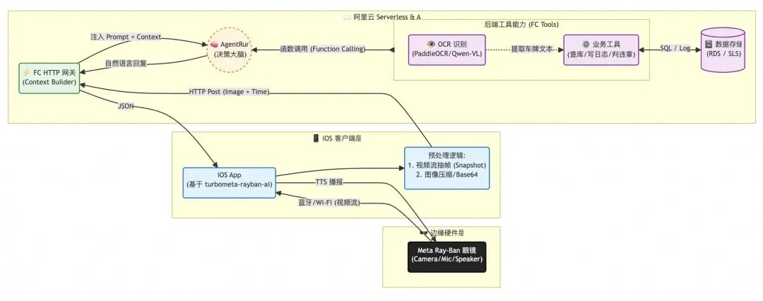 借助 Vibe Coding、云计算产品、及 GitHub 开源项目,一个从未写过 IOS 小白解锁了 Meta Ray-Ban 眼镜的开发,构建了一个 “端-管-云” 协同的智能原型:眼镜负责第一视角采集,iOS App 负责抽帧中继,云端 AgentRun 充当“大脑”进行意图理解与决策,指挥 FC 函数 完成查库、违章记录等实操。2天零碎时间,把一副消费级眼镜勉强魔改成“交警副驾”:)