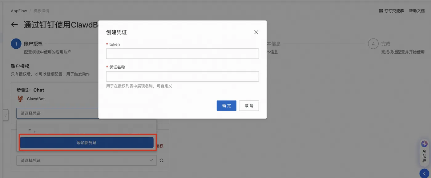 - 在连接流的账户授权配置向导页,点击添加新凭证。输入在配置Moltbot时获取的Token。