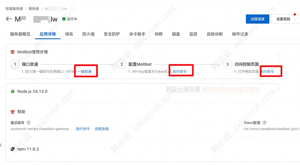 回到阿里云轻量应用服务器管理控制台,在防火墙中开通18789端口号,配置百炼API Key、执行命令,生成访问Moltbot (Clawdbot)的Token,操作非常简单: