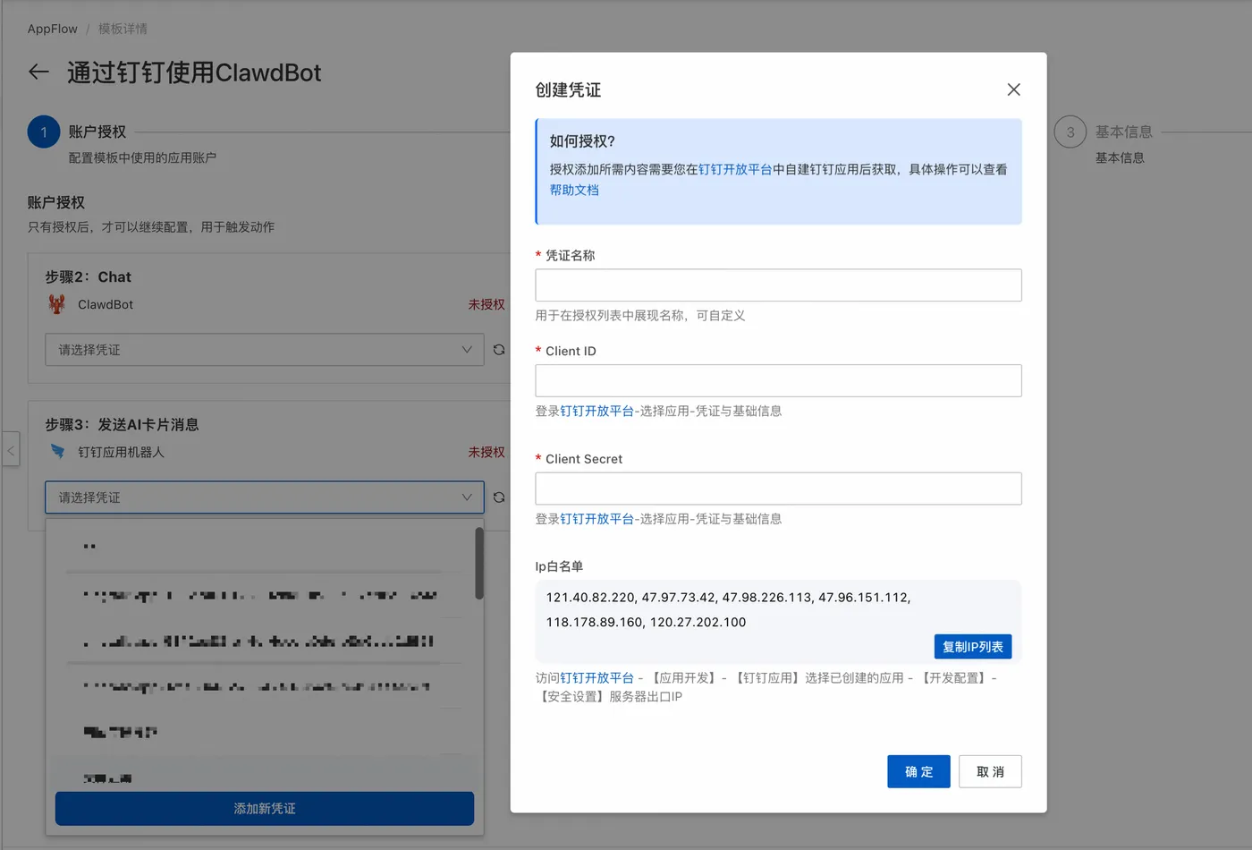- 在连接流的账户授权配置向导页,点击添加新凭证。在创建凭证对话框中,填入创建的应用的Client ID 和 Client Secret,并设置一个自定义凭证名称。