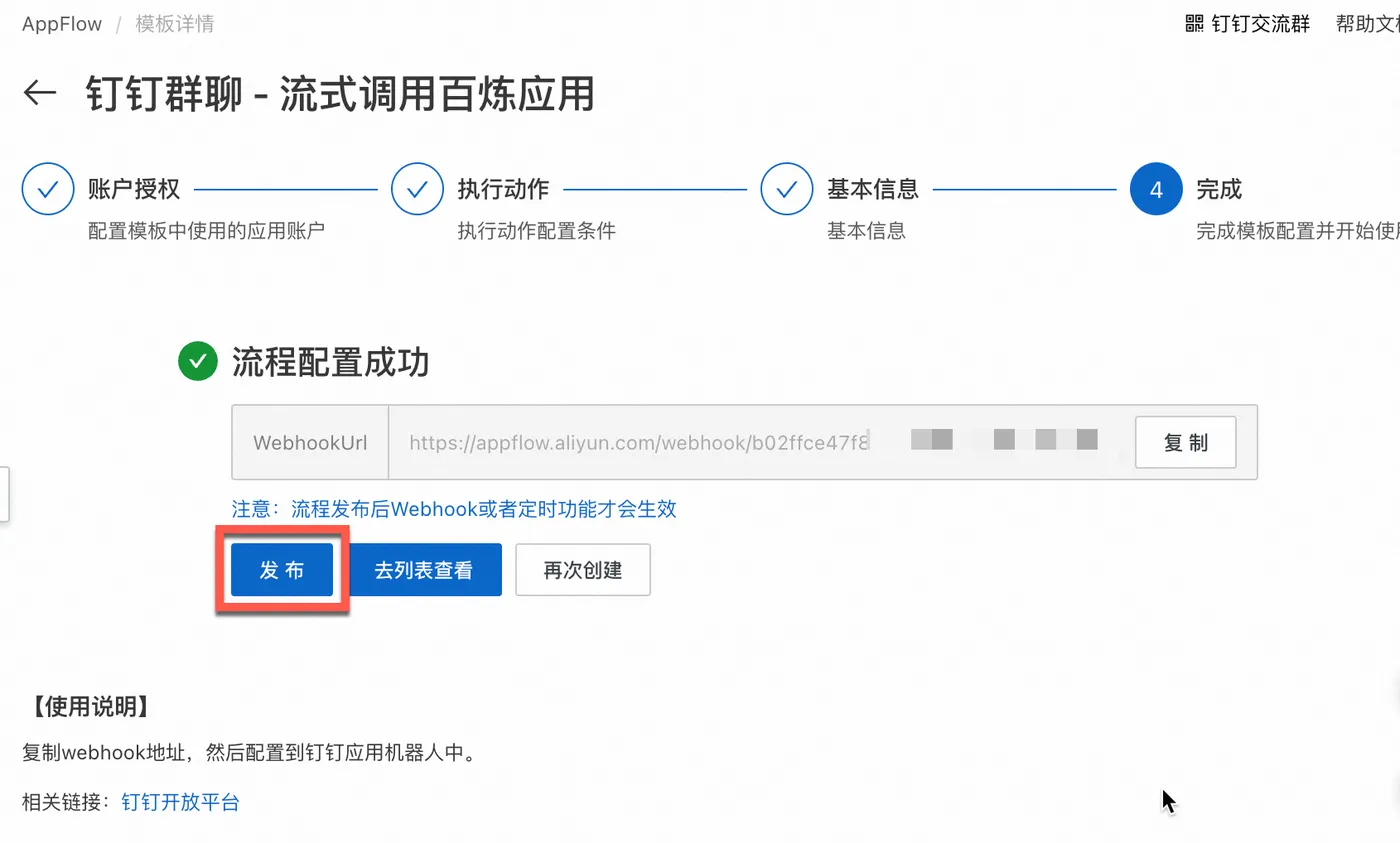 - 界面提示流程配置成功,复制WebhookUrl,点击发布。