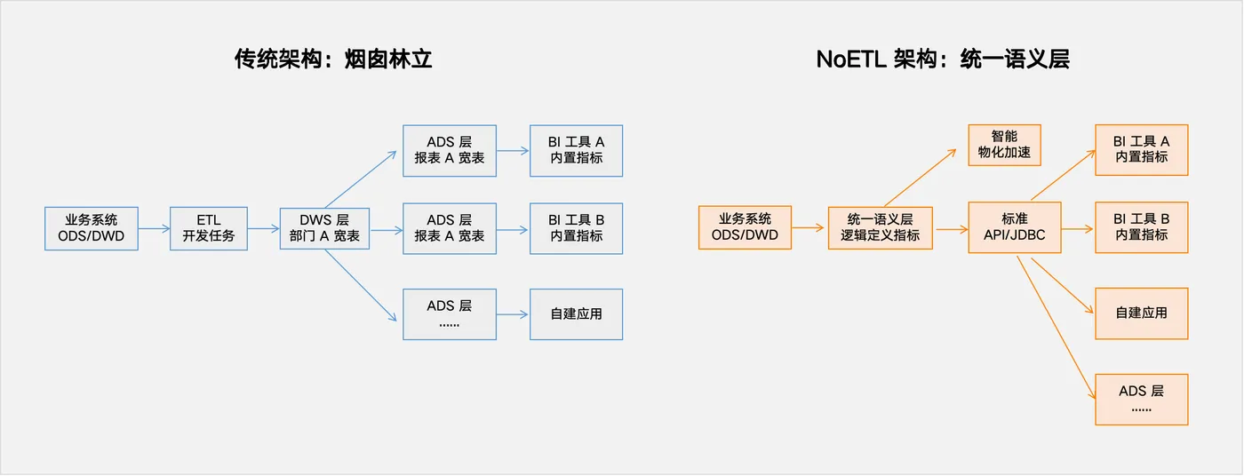 - NoETL架构(右):统一的语义层直接对接 DWD 明细数据,逻辑定义指标,向上通过标准 API/JDBC 服务各类消费端(BI、AI、应用)。