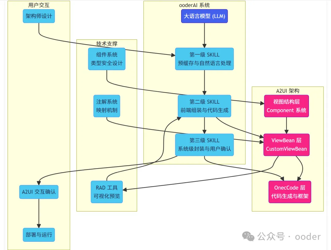 ooderAI 是 Ooder 生态系统的智能核心,基于大语言模型(LLM)构建,专注于代码生成、架构理解和开发流程优化。它通过三级 SKILLS 体系,实现从自然语言到完整系统的转换,为 A2UI 提供了强大的智能引擎,满足企业级应用的复杂性和可靠性要求。