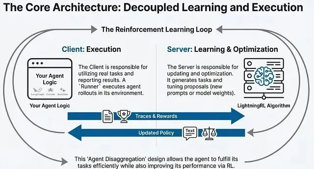 Agent Lightning 具备两个关键的设计优势:框架无关性和执行训练解耦。