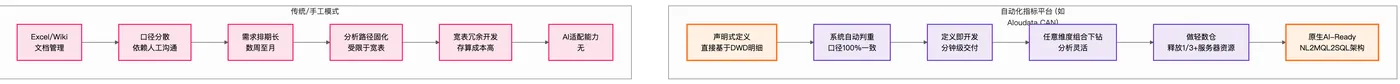 - 自动化指标平台(如 Aloudata CAN):本质是 基于 NoETL 语义编织的动态计算引擎。它不仅提供统一语义定义,更通过声明式策略直接基于 DWD 明细数据自动化生产指标,实现“一处定义,处处计算”,是架构范式的根本性变革。