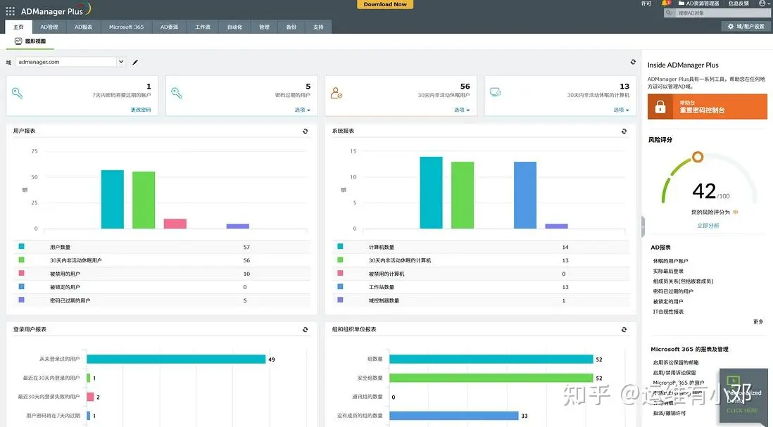 ADManager Plus 是一款身份治理与运维解决方案,具备全面的AD域管理及报表功能,可通过单一友好的控制台简化复杂的运维任务: