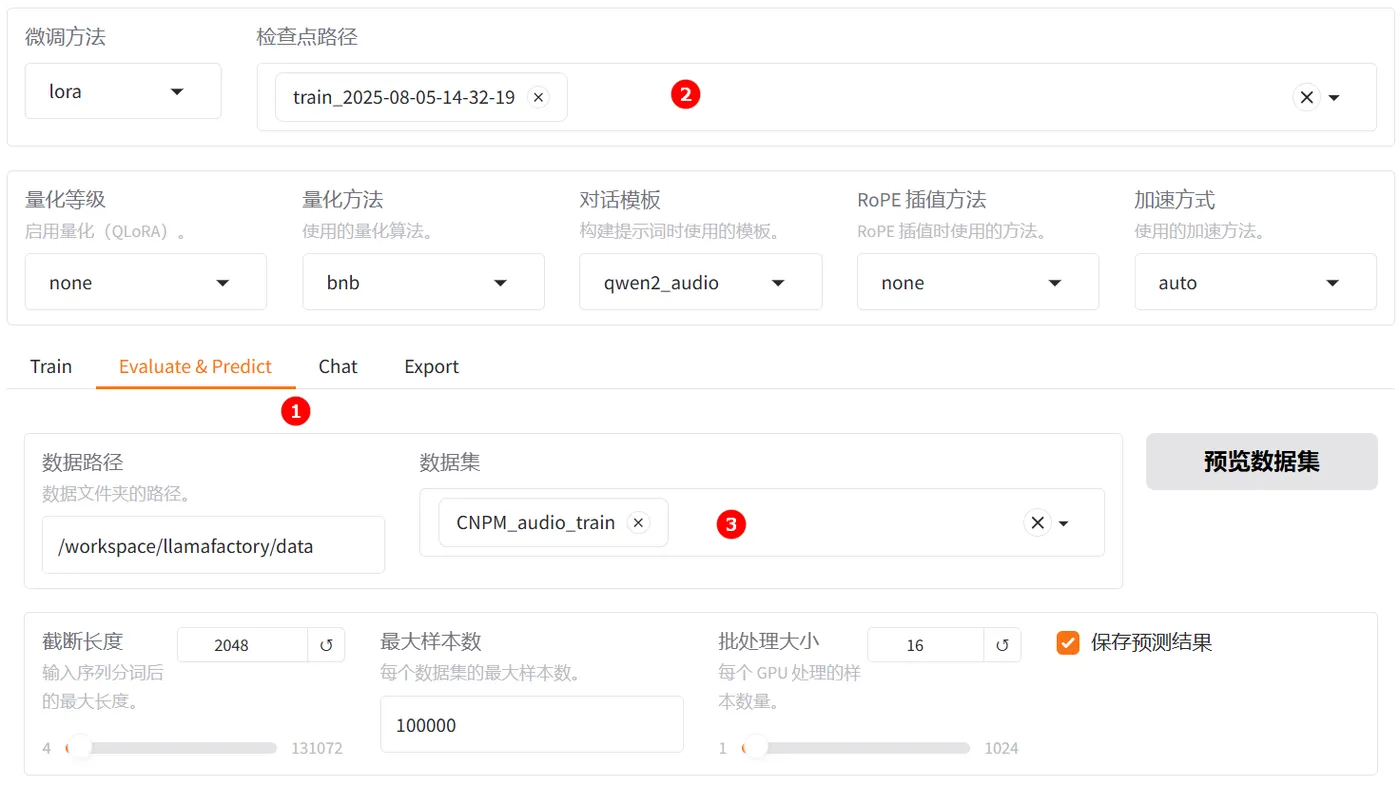 我们切换至“Evaluate & Predict”页面,选择微调后模型的检查点路径,然后选择平台预置的 CNPM_audio_train 数据集,并根据实际需求配置评估参数(本实践的参数设置如下图所示)