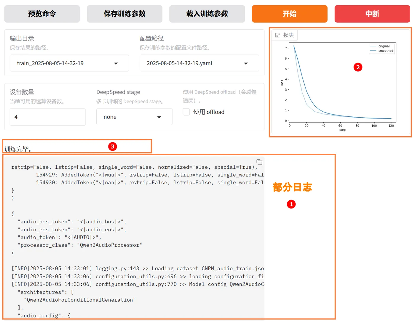 参数配置完成后,点击“开始”按钮启动微调任务。页面底部将实时显示微调过程中的日志信息,同时展示当前微调进度及 Loss 变化曲线。经过多轮微调后可以看出 Loss 逐渐趋于收敛,直到系统提示“训练完毕”