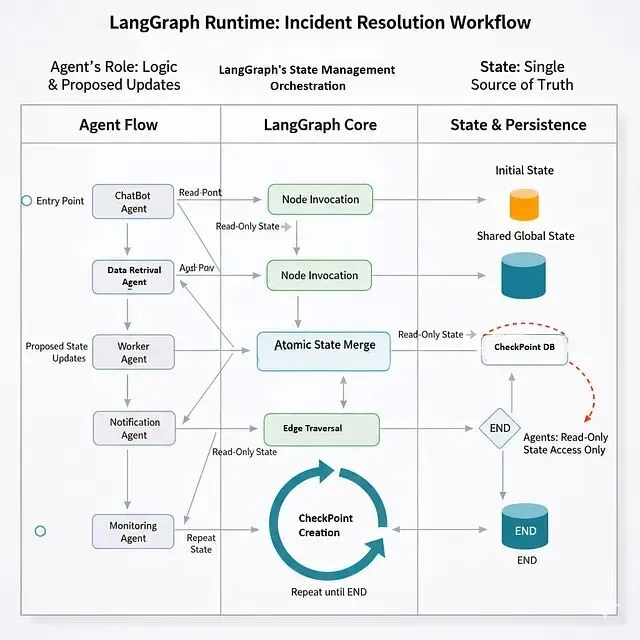 工作流启动后,LangGraph 用状态机来管理执行。首先从入口节点的初始状态开始,然后调用智能体函数并传入当前状态。智能体返回的是增量更新而不是整个状态的替换,LangGraph 拿到更新后原子性地合并到当前状态,接着根据图定义决定下一个节点,同时创建检查点把当前状态和执行位置持久化下来。这个过程一直重复,直到走到 END 节点或者达到最大迭代次数。