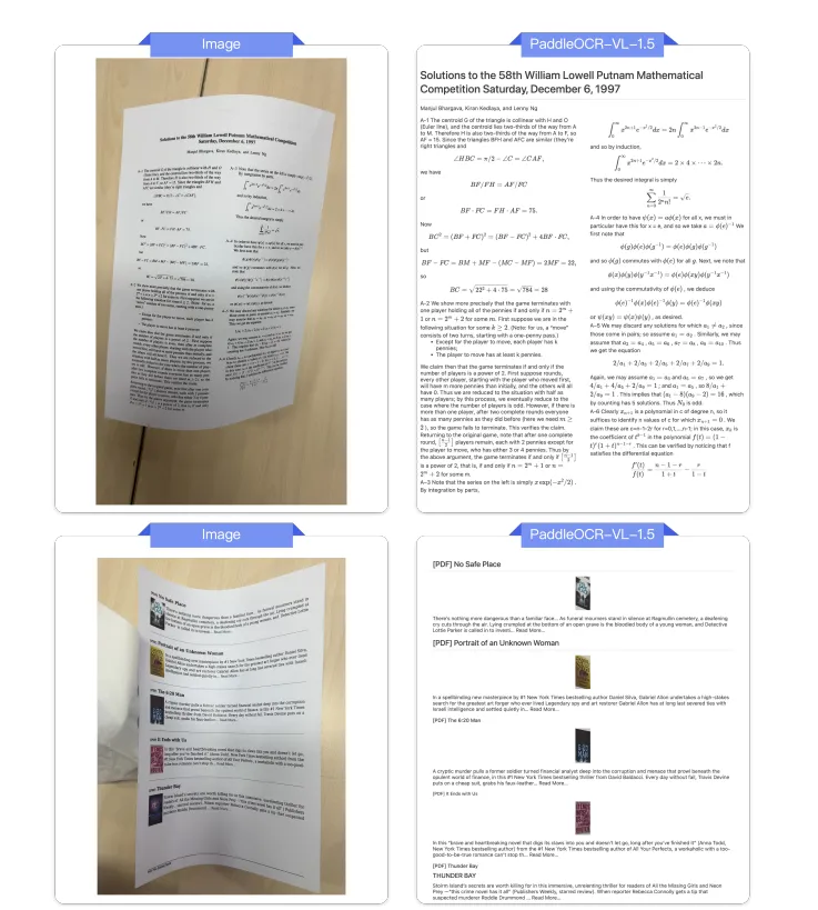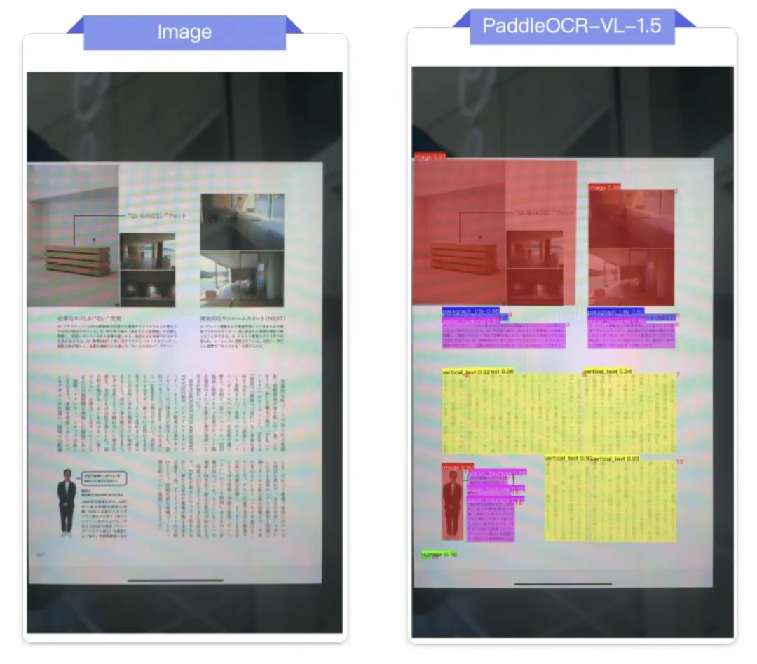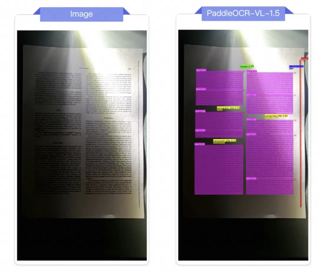 PaddleOCR-VL-1.5全球首次实现了 OCR 模型的“异形框定位”能力,使机器能够精准识别倾斜、弯折、拍照畸变等非规则文档形态,首次让“歪文档”实现稳定、可规模化解析。这个能力,解决了传统 OCR 模型在移动拍照、扫描件变形、复杂光照等真实场景中因文档形变导致的识别失败问题,可广泛应用于金融票据处理、档案数字化、政务文档流转等场景。