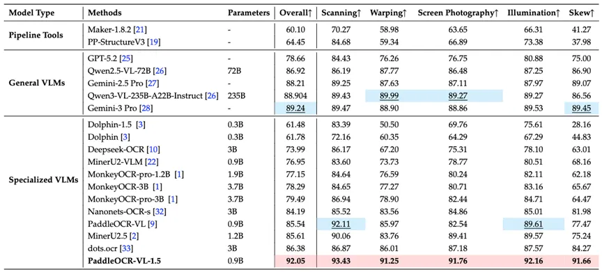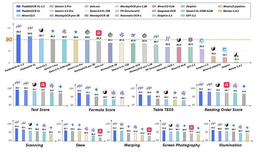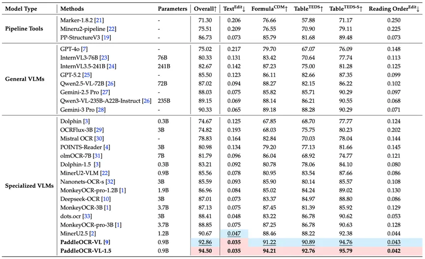 PaddleOCR-VL-1.5是基于文心大模型进行开发的,在表格结构理解(92.8 分)和阅读顺序预测(95.8 分)两项核心指标上均位列第一,分别领先 Gemini-3-Pro、DeepSeek-OCR 等主流模型2–5分不等。