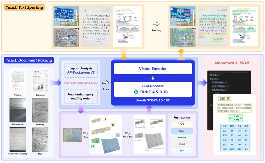 - 语言解码器基于 ERNIE-4.5-0.3B 大语言模型,结合 PaddleOCR-VL-1.5-0.9B 的任务适配模块,实现文档解析(Task1)与文本定位(Task2)的联合建模。