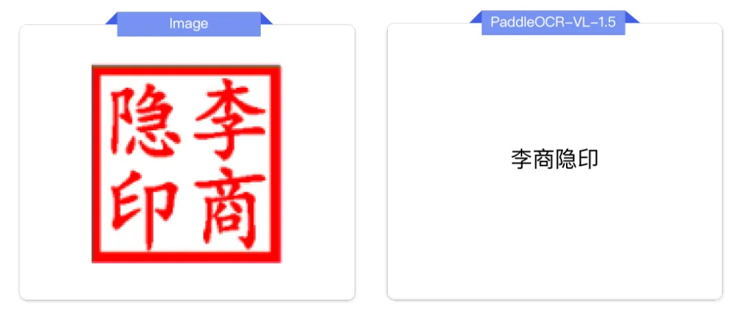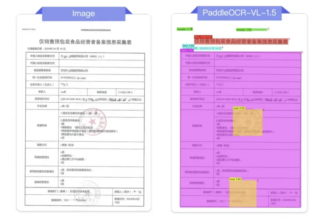 PaddleOCR-VL-1.5创新性地支持了文档元素的异形框定位,使得PaddleOCR-VL-1.5在扫描、倾斜、弯折、屏幕拍摄及复杂光照等真实落地场景中均表现卓越,实现了全面的SOTA,被誉为“歪文档克星”。此外,模型进一步集成了印章识别与文本检测识别任务,关键指标持续领跑主流模型。