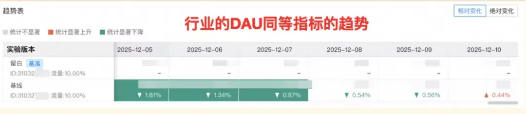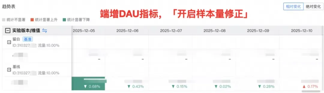打包留白实验的关键指标(比如整体DAU相对变化率)每日都在负向或负向置信来回波动