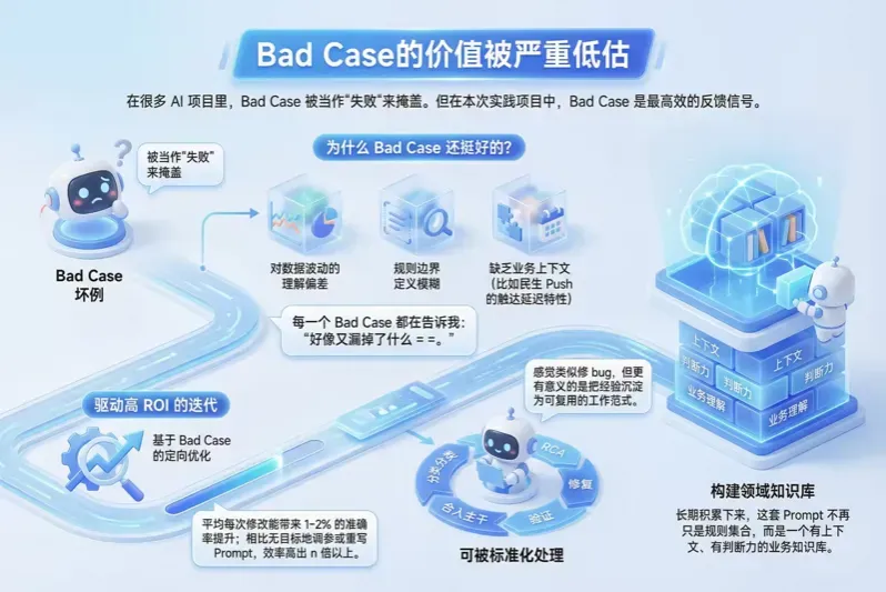 驱动高 ROI 的迭代:基于 Bad Case 的定向优化,平均每次修改能带来 1–2% 的准确率提升;相比无目标地调参或重写 Prompt,效率高出 n 倍以上。