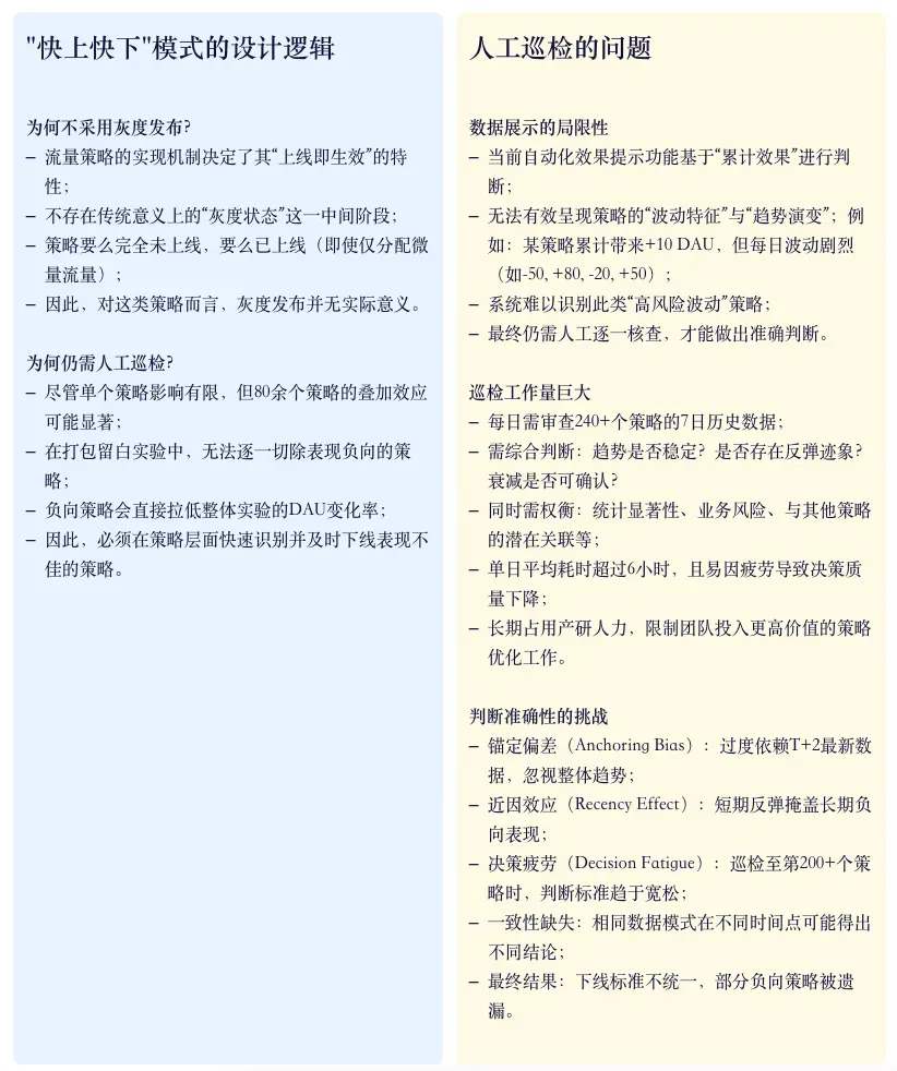 在互联网流量竞争白热化的时代,A/B实验已成为产品迭代的标准决策工具。当实验数量从数十增长到数百甚至数千数万时,传统的人工巡检模式遭遇瓶颈:需要专业的同学每日投入4-6小时逐个检视实验数据,判断其上线或下线;即使如此,由于时间压力和注意力限制,误判率依然居高不下。