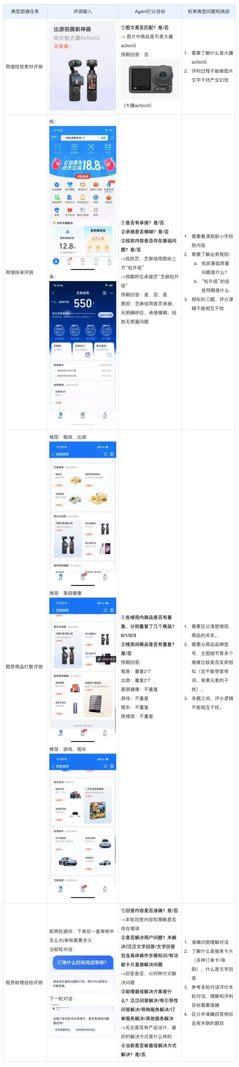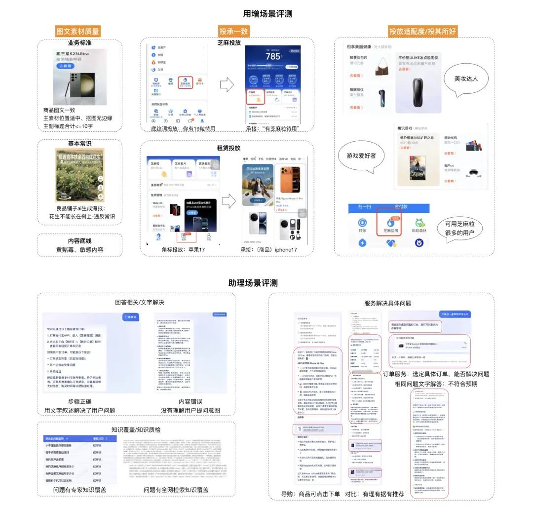 然而,随着芝麻信用域下各类AI应用场景的快速发展,AI助理、AI内容生成等技术的落地应用如雨后春笋般涌现——例如,去年我们仅支持一个商家经营助理场景,而今年仅对话式助理产品就已拓展出商家助理、租赁助理、回收助理、IM智能客服等多个产品,更不要说AIGC在用增投放场景的广泛应用。在这一背景下,原有的技术评测路线很快难以为继。
