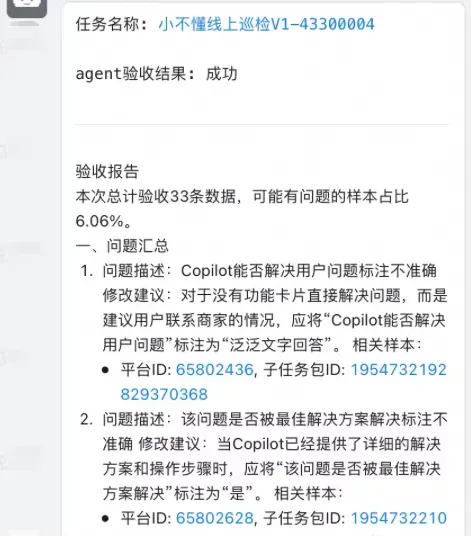 人审验收过去也是评测流程中非常耗时耗精力的一个环节。而当前,对于配置了评测agent的任务,只要打开预验收,就可以在人审标注后自动获得一份预验收报告,根据报告内容进行review即可。