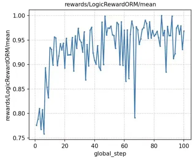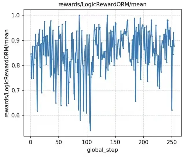 (b)逻辑奖励:这一部分主要是开放性打分,用于在没有ground truth的情况下,评价输出的内在逻辑性(包含题目-思考过程的逻辑一致性、思考过程内部的逻辑一致性/翔实性与重复性、思考过程到输出结果的逻辑一致性,根据不同的任务类型细节上会有一定差异),从而间接奖励正确的思考和正确的回答。(即使有ground truth的情况下,仍然加上这一部分逻辑奖励,使得reward打分更加平滑,有助于将探索逐步引导到正确方向,避免同组内奖励趋同)这部分我们采用14b模型进行逐点打分。