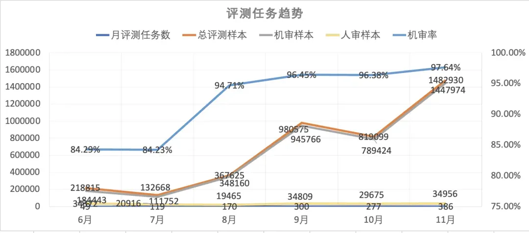 而基于上述迭代,我们在今年S1-S2业务快速增长,评测任务数、样本量、多样性都极速上升的背景下,机审率持续提升,维持人审样本量在一个比较稳定的水位。每月机审样本达百万级,机审覆盖率突破97%,年度节省千万级标注成本。