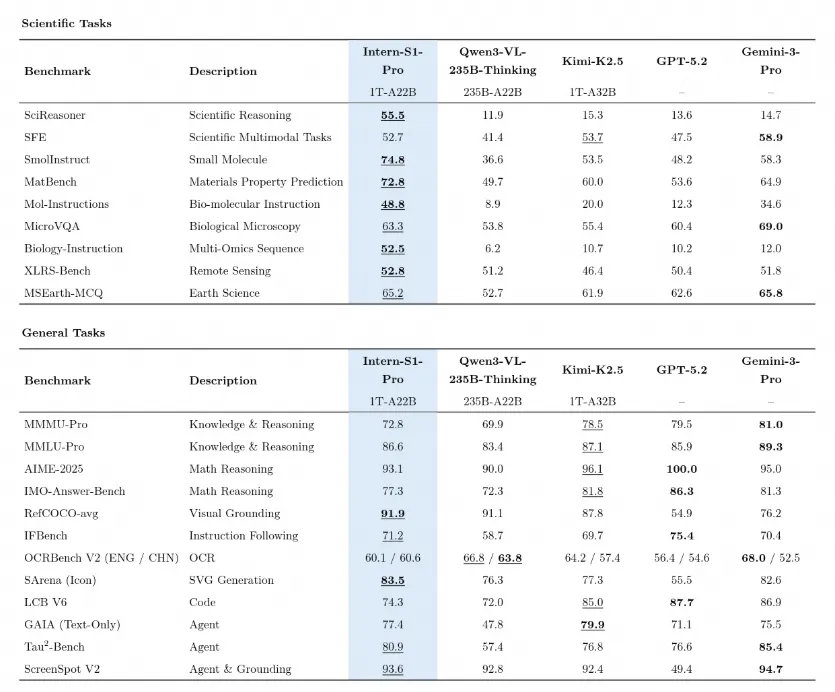 通过上述底层架构的创新,Intern-S1-Pro不仅在规模上刷新了科学多模态模型的参数规模上限,也为SAGE架构所提出的“通用能力与专业能力协同演进”提供了可落地的实现路径。