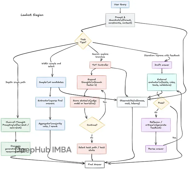 别一上来就用最复杂的技术。推荐的顺序是:先直接提问作为baseline,然后加CoT提示,再加Self-Consistency,最后才考虑ToT或Self-Refine。
