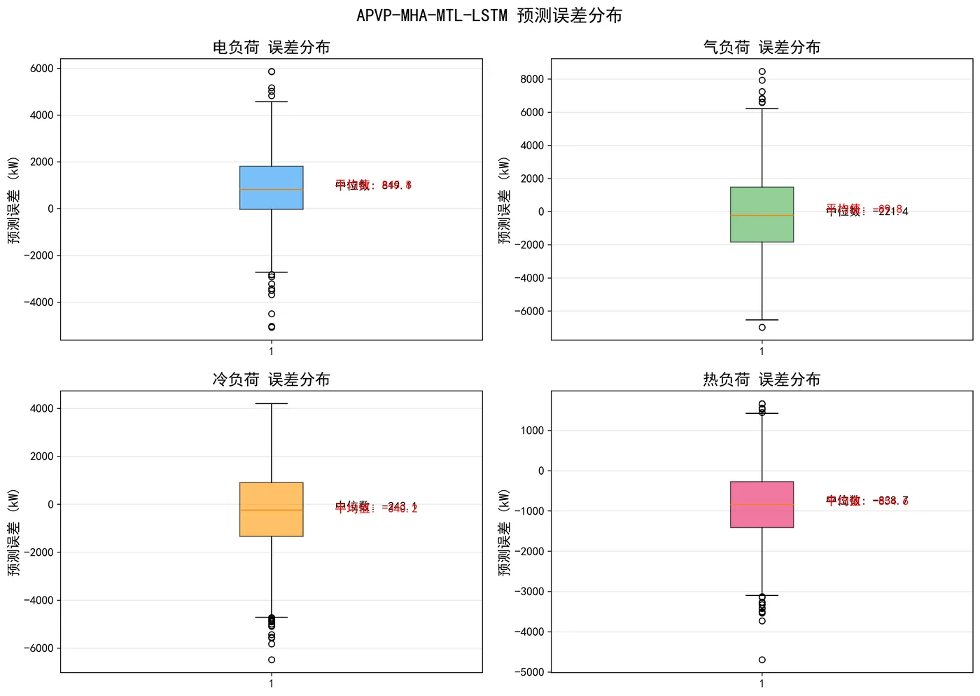 展示预测误差的统计特性,包括中位数、四分位距和异常值,帮助分析误差的分布情况。