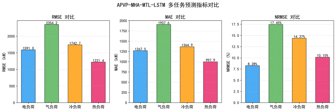 并排显示 RMSE、MAE 和 NRMSE 的跨负荷比较,便于比较不同负荷的预测性能。