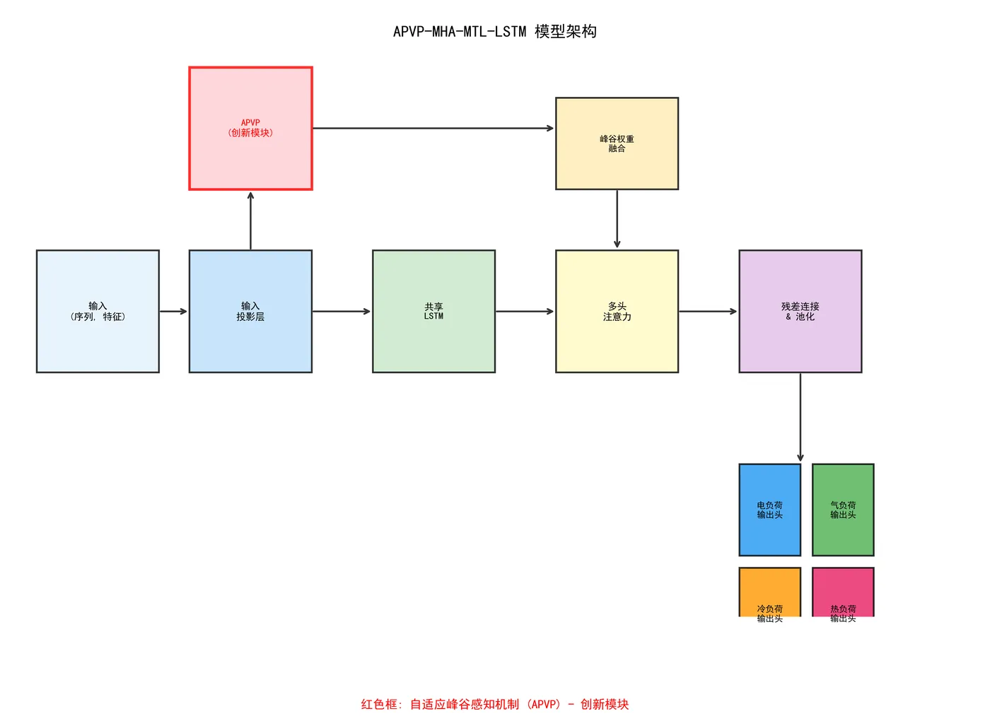 采用手动绘制方式,清晰展示 APVP - MHA - MTL - LSTM 各组件间的数据流和连接关系,特别用红色突出显示创新模块。