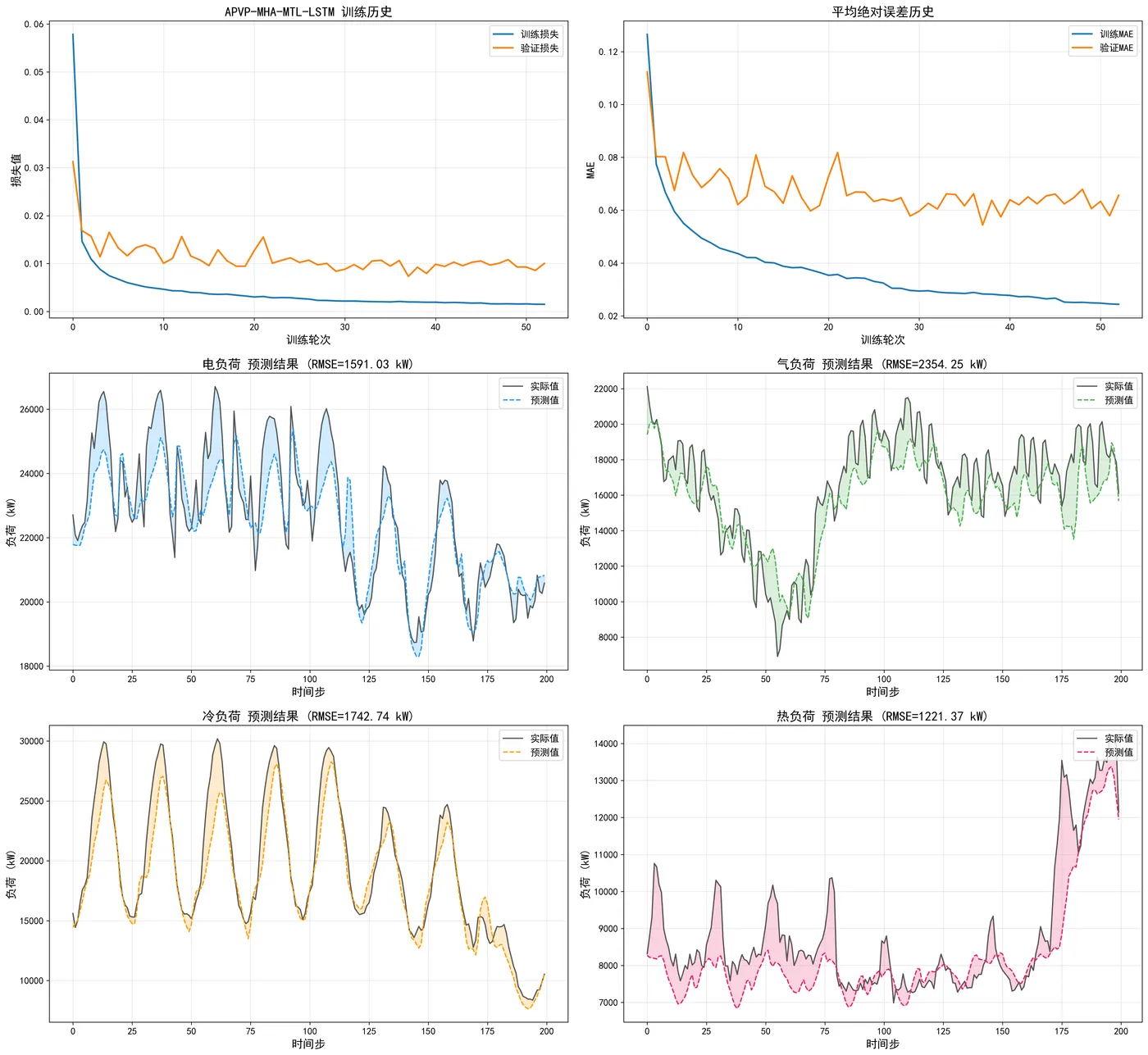 模型评估体系构建了多维度、多指标的综合性评价框架,从不同角度全面衡量预测性能。评估阶段首先将标准化预测结果反变换回原始量纲,然后针对每种负荷类型独立计算四项核心指标:均方根误差(RMSE)衡量预测误差的总体幅度,平均绝对误差(MAE)提供误差的直观理解,平均绝对百分比误差(MAPE)评估相对误差水平,归一化均方根误差(NRMSE)提供无量纲的性能比较基准。这些指标的计算考虑了数值稳定性,如在 MAPE 计算中加入了 1e - 8 的小常数防止除零错误。评估结果以结构化方式呈现,包括每种负荷的详细指标值和整体平均值,为模型性能的横向对比和纵向改进提供了量化依据。