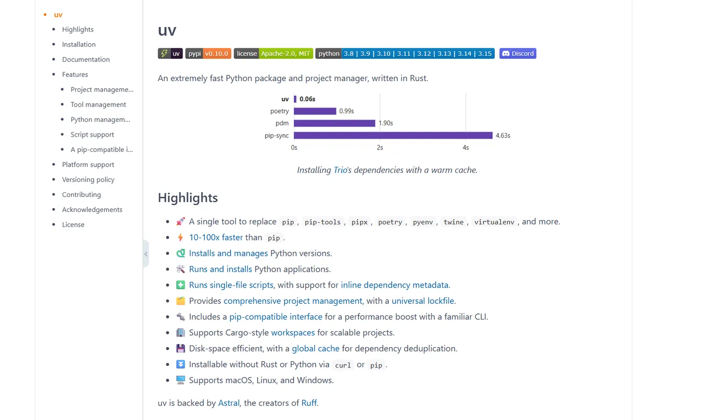 # 运行 Python 脚本 uv run main.py # 运行命令(如 pytest) uv run pytest tests/ # 指定 Python 版本运行 uv run --python 3.10 main.py