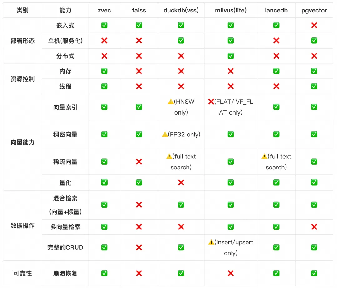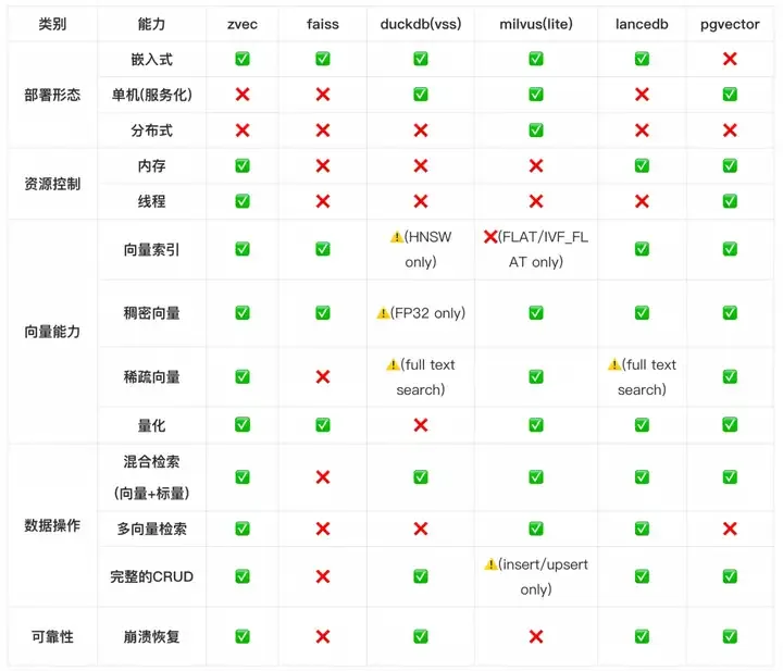 - 纯索引库(如Faiss):缺乏标量属性存储、混合查询、完整 CRUD 以及崩溃恢复等数据库能力,需大量外围工程实现生产级功能,工程成本显著;