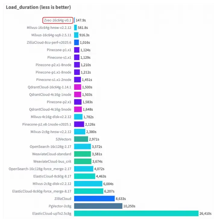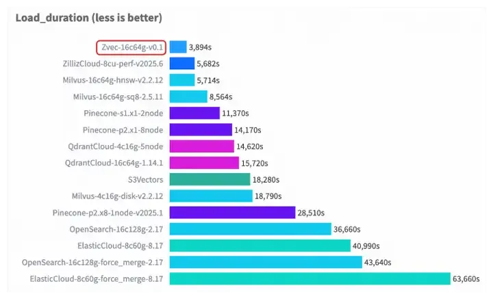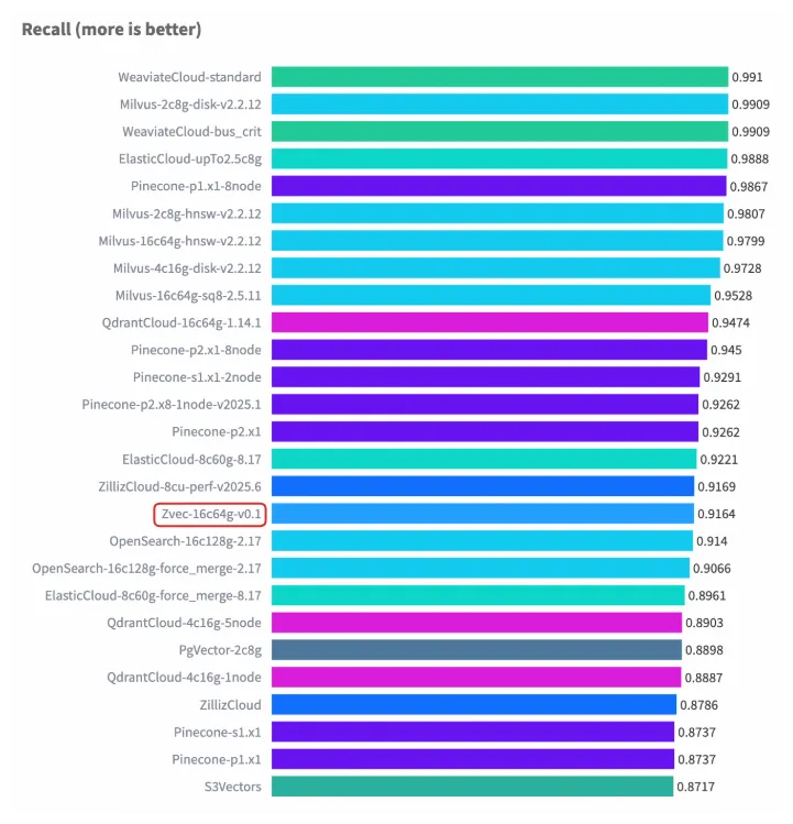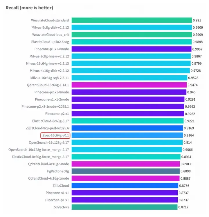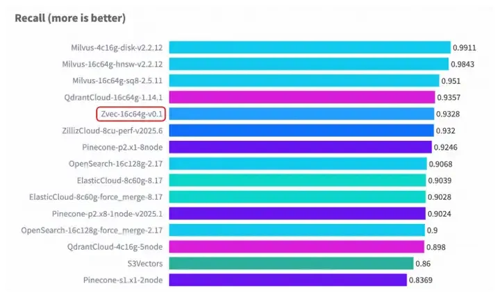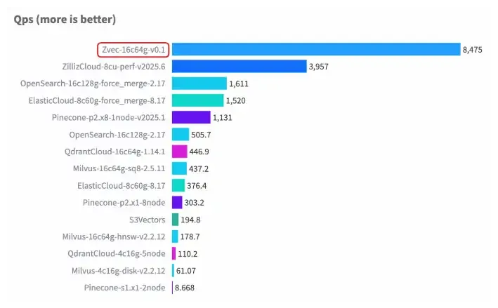 在 VectorDBBench 的典型场景(Cohere 10M 数据集)中,Zvec 在相当硬件配置以及对齐 Recall 水平的前提下,检索吞吐超过了 8000 QPS,是此前榜单首位(ZillizCloud)的 2 倍以上,同时构建延迟大幅缩短,展现出全面领先的性能优势。
