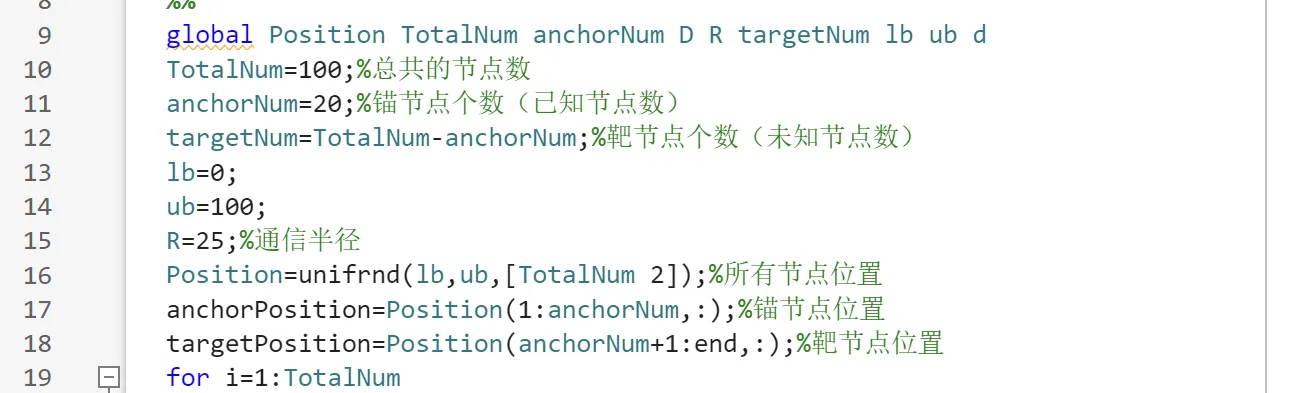 - 锚节点数量:随着锚节点数量的增加,定位误差呈下降趋势。这是因为更多的锚节点提供了更多的距离信息,有助于提高定位精度。
