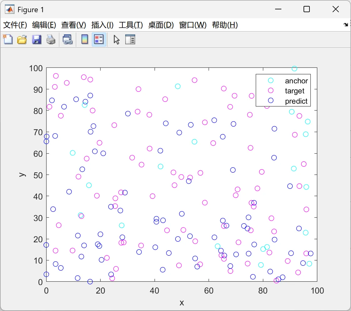 在100mX100m的区域内随机产生100个节点,10个锚节点从中随机选取产生,其余90个节点为