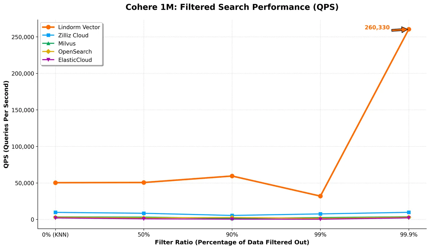 在 100 万量级下,Lindorm 展现了碾压级的性能优势:Lindorm QPS 突破 5.6万,同时将延迟控制在 2ms;相比之下,主流开源产品如 Milvus、OpenSearch 的 QPS 普遍在 3,000 左右。