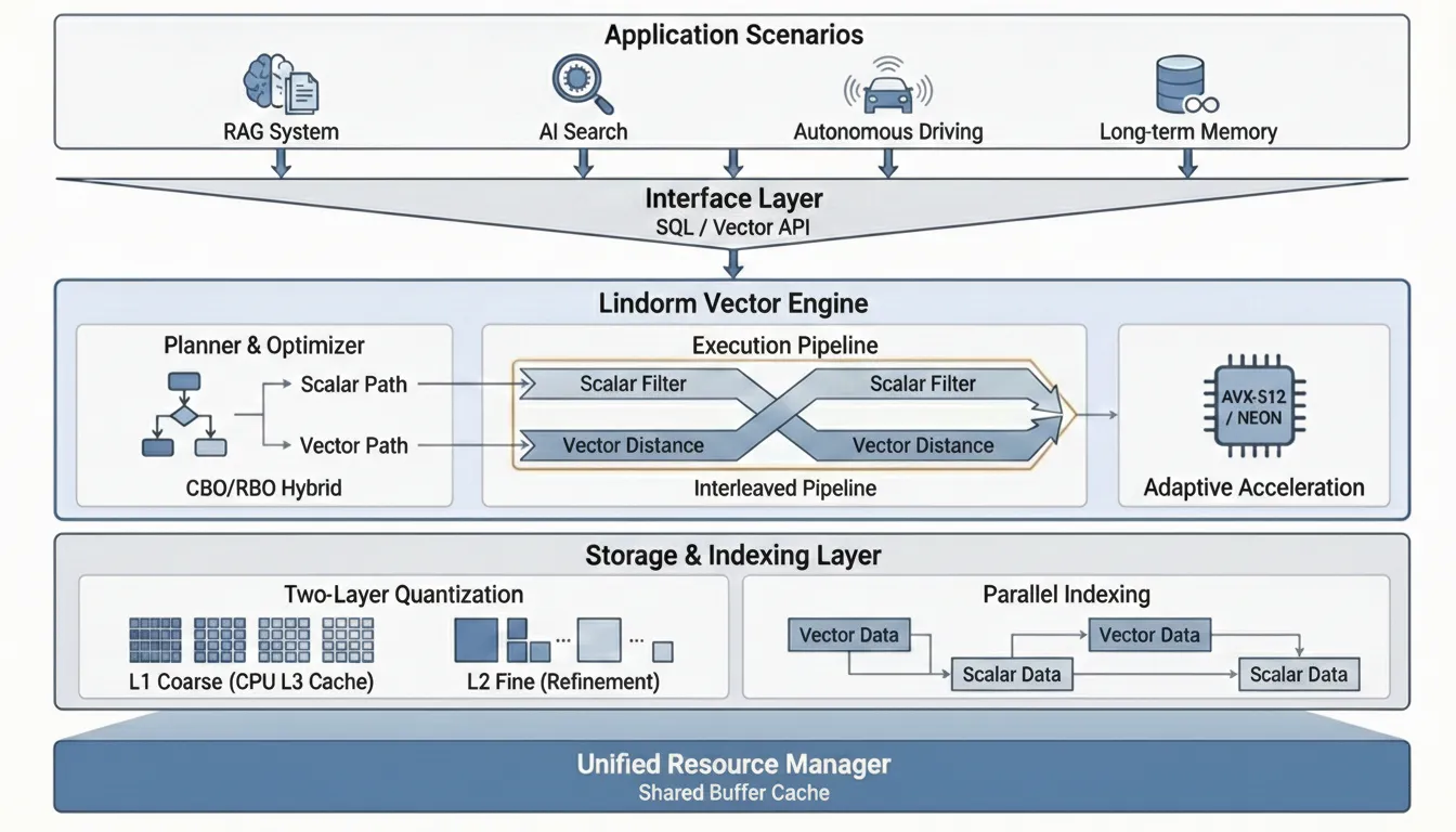 - 以向量为锚的统一抽象:Lindorm 彻底摒弃了“外挂”思维,而是以向量数据为锚点,重新设计了整个系统的存储结构、优化器与执行器。在这种架构下,标量属性不再是向量的附属品,而是与向量特征紧密交织的原生一等公民。