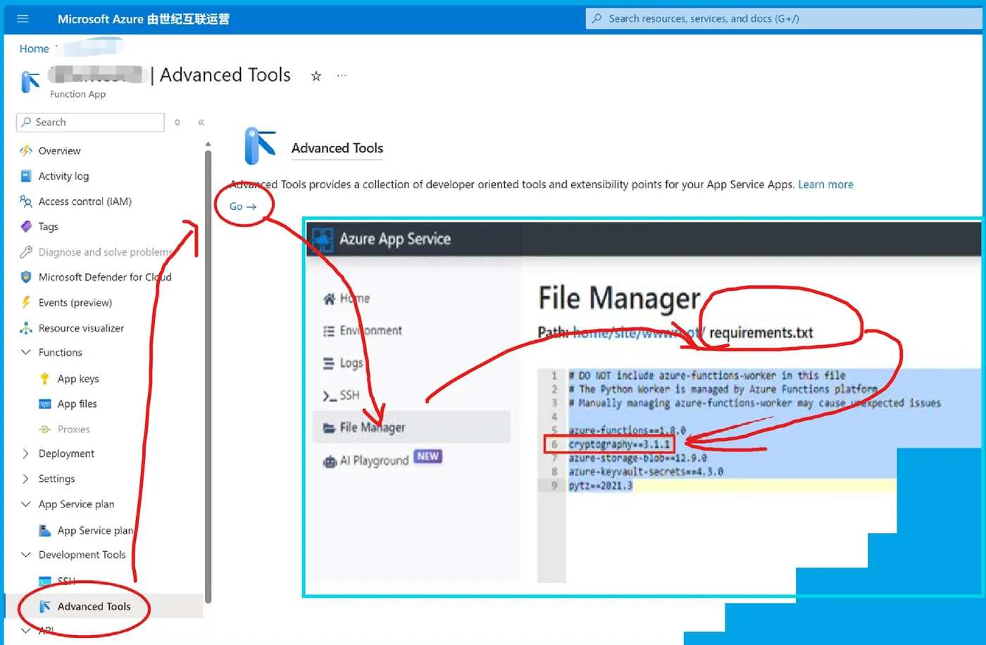 但是,如果是在Azure门户中,直接通过页面创建的Python Function,如何来修改 cryptography 版本呢?