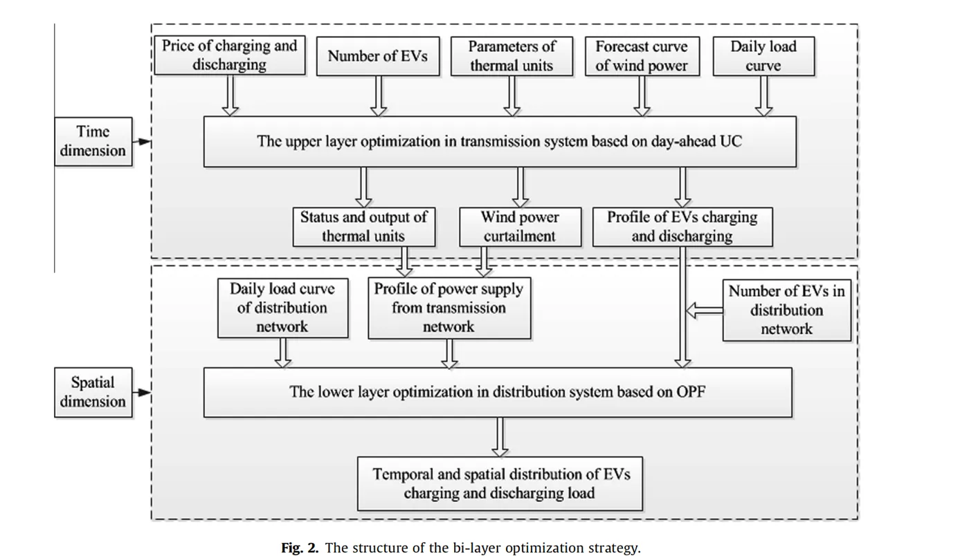 构建输配电网协同的双层优化模型,实现电动汽车充放电的时域 + 空域联合调度。上层输电网以机组组合为基础,输入电价、电动汽车数量、风电预测曲线等数据,完成时域优化,输出火电机组状态、风电弃风量、电动汽车充放电时域曲线;下层配电网以最优潮流为基础,输入上层结果与配电网负荷数据,完成空域优化,最终得到电动汽车充放电的时空分布方案,实现输配电网的协同调度。