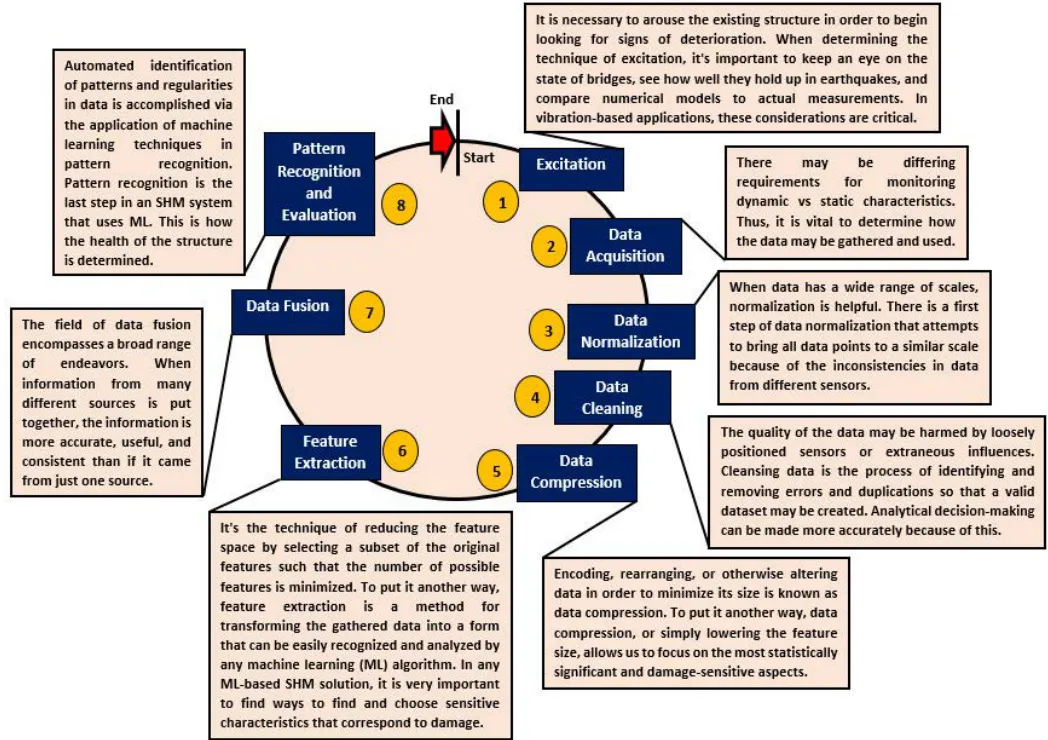数据驱动的SHM系统通过传感器网络实时采集结构响应信号(如振动、应变、位移),结合特征提取与模式识别评估结构健康状态。核心模块包括: