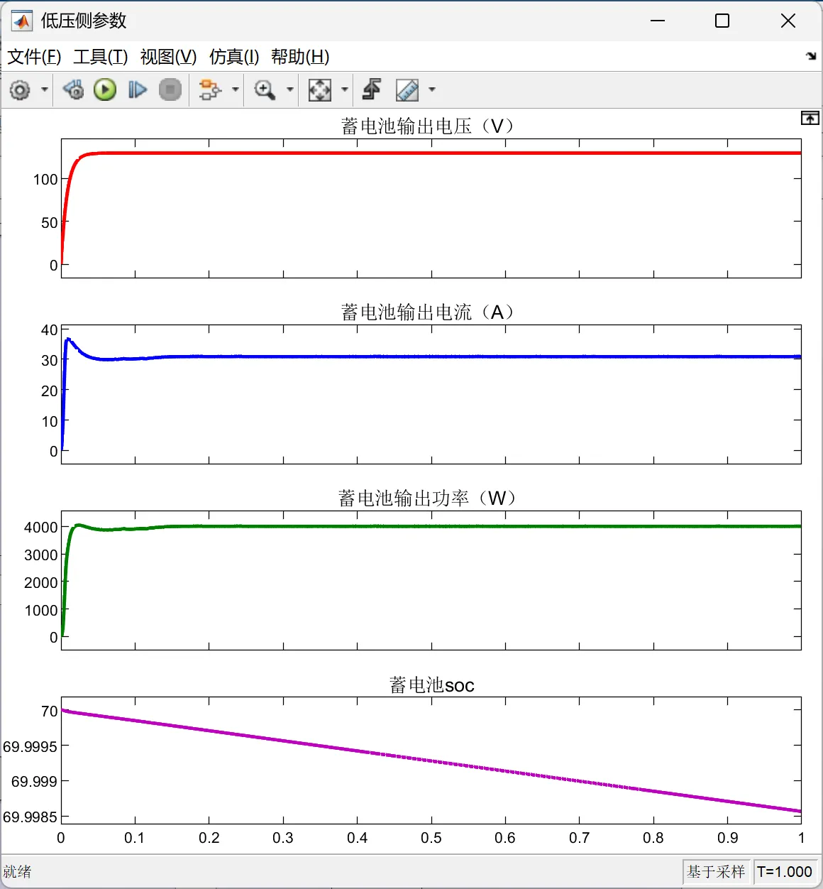 在放电模式下,设定一个期望的输出电压值,运行仿真模型。仿真结果显示,输出电压能够在较短时间内稳定在期望值附近,且波动范围较小。同时,电池的放电电流也能够按照控制策略的要求进行限制,避免了电池的过放现象。这表明放电模式下的输出电压外环、电池电流内环的双闭环控制策略能够有效地实现输出电压的稳定控制与电池的合理放电。