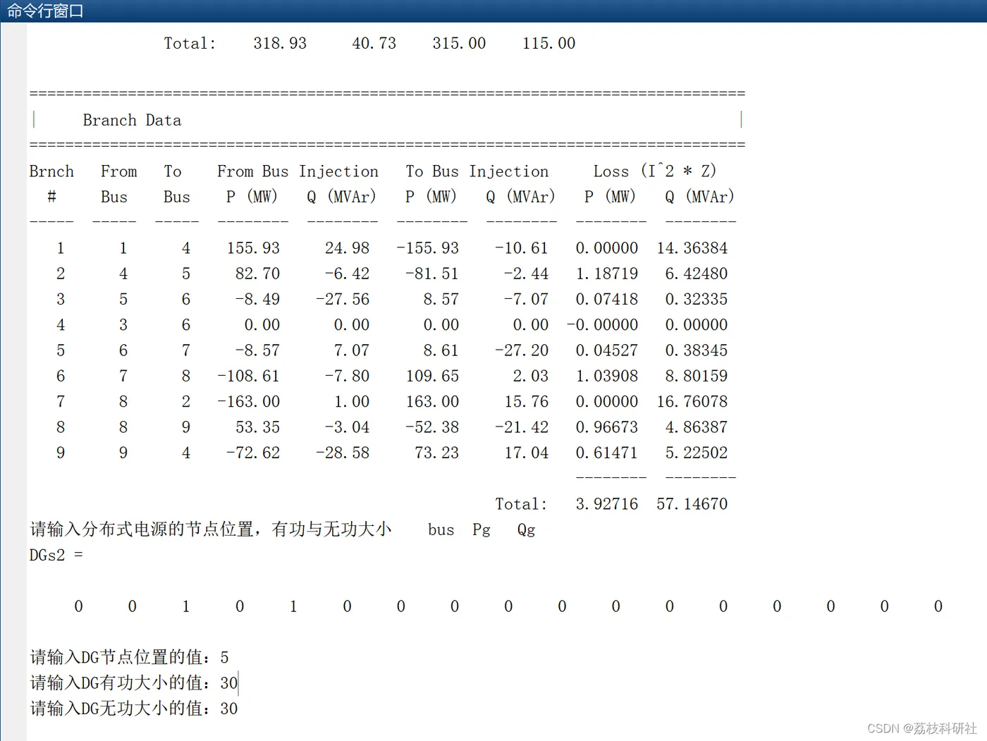 ans = 1.0e+02 * 1 至 6 列 0.010000000000000 0.040000000000000 0 0.000576000000000 0 2.500000000000000 0.040000000000000 0.050000000000000 0.000170000000000 0.000920000000000 0.001580000000000 2.500000000000000 0.050000000000000 0.060000000000000 0.000390000000000 0.001700000000000 0.003580000000000 1.500000000000000 0.030000000000000 0.060000000000000 0 0.000586000000000 0 3.000000000000000 0.060000000000000 0.070000000000000 0.000119000000000 0.001008000000000 0.002090000000000 1.500000000000000 0.070000000000000 0.080000000000000 0.000085000000000 0.000720000000000 0.001490000000000 2.500000000000000 0.080000000000000 0.020000000000000 0 0.000625000000000 0 2.500000000000000 0.080000000000000 0.090000000000000 0.000320000000000 0.001610000000000 0.003060000000000 2.500000000000000 0.090000000000000 0.040000000000000 0.000100000000000 0.000850000000000 0.001760000000000 2.500000000000000 7 至 12 列 2.500000000000000 2.500000000000000 0 0 0.010000000000000 -3.600000000000000 2.500000000000000 2.500000000000000 0 0 0.010000000000000 -3.600000000000000 1.500000000000000 1.500000000000000 0 0 0.010000000000000 -3.600000000000000 3.000000000000000 3.000000000000000 0 0 0.010000000000000 -3.600000000000000 1.500000000000000 1.500000000000000 0 0 0.010000000000000 -3.600000000000000 2.500000000000000 2.500000000000000 0 0 0.010000000000000 -3.600000000000000 2.500000000000000 2.500000000000000 0 0 0.010000000000000 -3.600000000000000 2.500000000000000 2.500000000000000 0 0 0.010000000000000 -3.600000000000000 2.500000000000000 2.500000000000000 0 0 0.010000000000000 -3.600000000000000 13 列 3.600000000000000 3.600000000000000 3.600000000000000 3.600000000000000 3.600000000000000 3.600000000000000 3.600000000000000 3.600000000000000 3.600000000000000 Newton's method power flow converged in 4 iterations. Converged in 0.04 seconds ================================================================================ | System Summary | ================================================================================ How many? How much? P (MW) Q (MVAr) --------------------- ------------------- ------------- ----------------- Buses 9 Total Gen Capacity 0.0 0.0 to 0.0 Generators 2 On-line Capacity 0.0 0.0 to 0.0 Committed Gens 2 Generation (actual) 318.9 40.7 Loads 3 Load 315.0 115.0 Fixed 3 Fixed 315.0 115.0 Dispatchable 0 Dispatchable -0.0 of -0.0 -0.0 Shunts 0 Shunt (inj) -0.0 0.0 Branches 9 Losses (I^2 * Z) 3.93 57.15 Transformers 0 Branch Charging (inj) - 131.4 Inter-ties 0 Total Inter-tie Flow 0.0 0.0 Areas 1 Minimum Maximum ------------------------- -------------------------------- Voltage Magnitude 0.962 p.u. @ bus 9 1.000 p.u. @ bus 1 Voltage Angle -9.70 deg @ bus 5 1.99 deg @ bus 2 P Losses (I^2*R) - 1.19 MW @ line 4-5 Q Losses (I^2*X) - 16.76 MVAr @ line 8-2 ================================================================================ | Bus Data | ================================================================================ Bus Voltage Generation Load # Mag(pu) Ang(deg) P (MW) Q (MVAr) P (MW) Q (MVAr) ----- ------- -------- -------- -------- -------- -------- 1 1.000 0.000 155.93 24.98 - - 2 1.000 1.987 163.00 15.76 - - 3 0.999 -9.097 - - - - 4 0.990 -5.207 - - - - 5 0.977 -9.705 - - 90.00 30.00 6 0.999 -9.097 - - - - 7 0.982 -8.472 - - 100.00 35.00 8 0.995 -3.887 - - - - 9 0.962 -8.800 - - 125.00 50.00 -------- -------- -------- -------- Total: 318.93 40.73 315.00 115.00 ================================================================================ | Branch Data | ================================================================================ Brnch From To From Bus Injection To Bus Injection Loss (I^2 * Z) # Bus Bus P (MW) Q (MVAr) P (MW) Q (MVAr) P (MW) Q (MVAr) ----- ----- ----- -------- -------- -------- -------- -------- -------- 1 1 4 155.93 24.98 -155.93 -10.61 0.00000 14.36384 2 4 5 82.70 -6.42 -81.51 -2.44 1.18719 6.42480 3 5 6 -8.49 -27.56 8.57 -7.07 0.07418 0.32335 4 3 6 0.00 0.00 0.00 0.00 -0.00000 0.00000 5 6 7 -8.57 7.07 8.61 -27.20 0.04527 0.38345 6 7 8 -108.61 -7.80 109.65 2.03 1.03908 8.80159 7 8 2 -163.00 1.00 163.00 15.76 0.00000 16.76078 8 8 9 53.35 -3.04 -52.38 -21.42 0.96673 4.86387 9 9 4 -72.62 -28.58 73.23 17.04 0.61471 5.22502 -------- -------- Total: 3.92716 57.14670 请输入分布式电源的节点位置,有功与无功大小 bus Pg Qg DGs2 = 0 0 1 0 1 0 0 0 0 0 0 0 0 0 0 0 0 0 请输入DG节点位置的值:5 请输入DG有功大小的值:30 请输入DG无功大小的值:30 DGs1 = 5 30 30 DGs = 1 至 20 列 5 30 30 0 0 1 0 1 0 0 0 0 0 0 0 0 0 0 0 0 21 列 0 mpc = 包含以下字段的 struct: version: '2' baseMVA: 100 bus: [9×13 double] gen: [3×21 double] branch: [9×17 double] et: 0.039999999999999 success: 1 Newton's method power flow converged in 4 iterations. Converged in 159.03 seconds ================================================================================ | System Summary | ================================================================================ How many? How much? P (MW) Q (MVAr) --------------------- ------------------- ------------- ----------------- Buses 9 Total Gen Capacity 0.0 0.0 to 0.0 Generators 3 On-line Capacity 0.0 0.0 to 0.0 Committed Gens 3 Generation (actual) 318.3 25.4 Loads 3 Load 315.0 115.0 Fixed 3 Fixed 315.0 115.0 Dispatchable 0 Dispatchable -0.0 of -0.0 -0.0 Shunts 0 Shunt (inj) -0.0 0.0 Branches 9 Losses (I^2 * Z) 3.30 47.95 Transformers 0 Branch Charging (inj) - 137.5 Inter-ties 0 Total Inter-tie Flow 0.0 0.0 Areas 1 Minimum Maximum ------------------------- -------------------------------- Voltage Magnitude 0.976 p.u. @ bus 9 1.027 p.u. @ bus 3 Voltage Angle -7.38 deg @ bus 9 3.70 deg @ bus 2 P Losses (I^2*R) - 1.08 MW @ line 8-9 Q Losses (I^2*X) - 16.61 MVAr @ line 8-2 ================================================================================ | Bus Data | ================================================================================ Bus Voltage Generation Load # Mag(pu) Ang(deg) P (MW) Q (MVAr) P