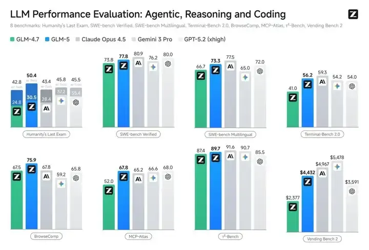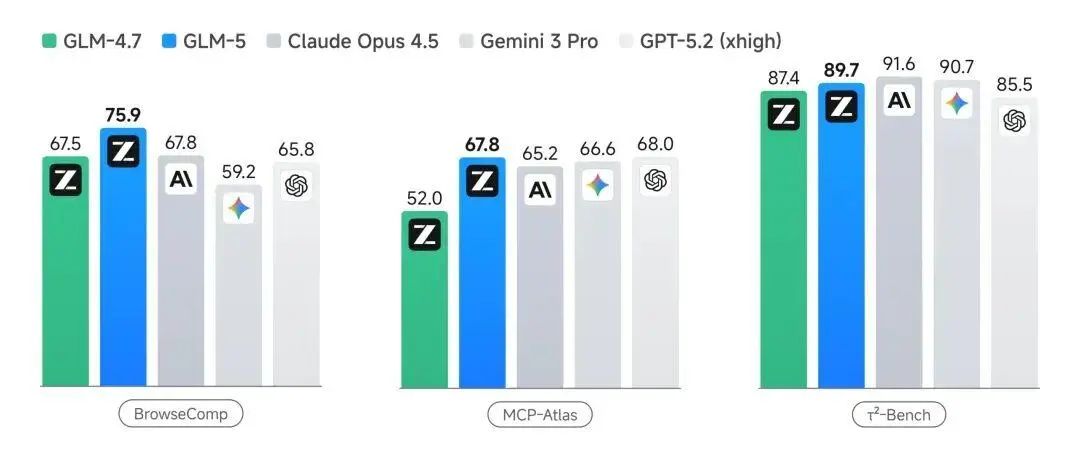 GLM-5 在 Agent 能力上实现开源 SOTA,在多个评测基准中取得开源第一:在 BrowseComp(联网检索与信息理解)、MCP-Atlas(工具调用和多步骤任务执行)和 τ²-Bench(复杂多工具场景下的规划和执行)均取得最佳表现。