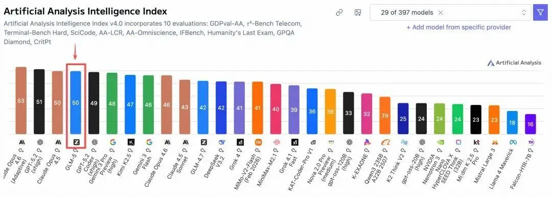 在全球权威的 Artificial Analysis 榜单中,GLM-5 位居全球第四、开源第一。