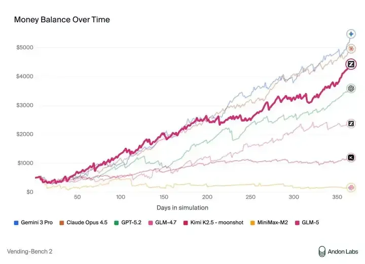 在衡量模型经营能力的 Vending Bench 2 中,GLM-5 获得开源模型第一的表现。Vending Bench 2 要求模型在一年期内经营一个模拟的自动售货机业务,GLM-5 最终账户余额达到 4432 美元,经营表现接近 Claude Opus 4.5,展现了出色的长期规划和资源管理能力。