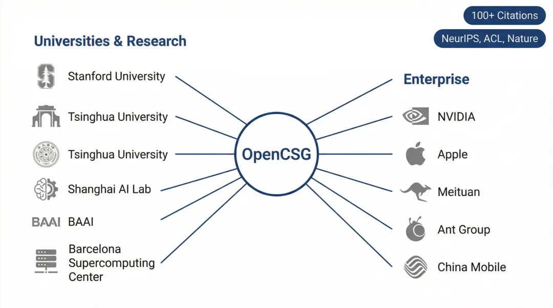 OpenCSG 以 Chinese FineWeb Edu 为代表的高质量中文数据集体系,已被全球高校、科研机构及科技企业广泛采用,是支撑中文 NLP 研究与大模型产业落地的核心数据基础,从顶尖高校 AI 实验室到企业级生产环境,它持续为大模型预训练、指令微调与领域适配等关键环节提供可靠支撑,推动研究成果向规模化应用高效转化;在学术领域,该数据集已被 100 + 篇论文引用,多次入选 NeurIPS、ACL 等国际顶会及 Nature 子刊、JMLR 等权威期刊,成为验证中文语言模型泛化能力、知识建模效率与跨语言迁移效果的代表性基础资源。