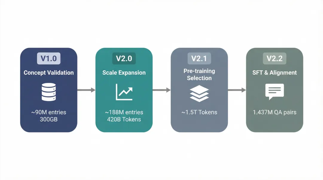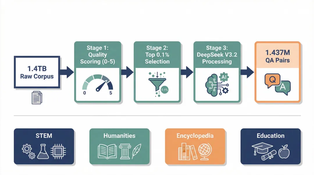 在 SFT 数据方面,V2.2 版本采用“质量至上”策略:只选取评分最高的 Top 0.1% 语料作为种子,利用 DeepSeek V3.2 的阅读理解能力,严格基于原文 Context 生成问答对。不同于自由生成的聊天数据,V2.2 的每一条数据都有确凿的原文依据,有效避免了模型幻觉和事实错误。