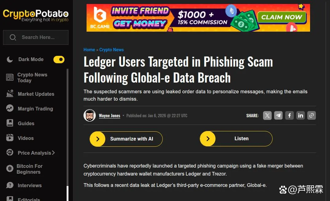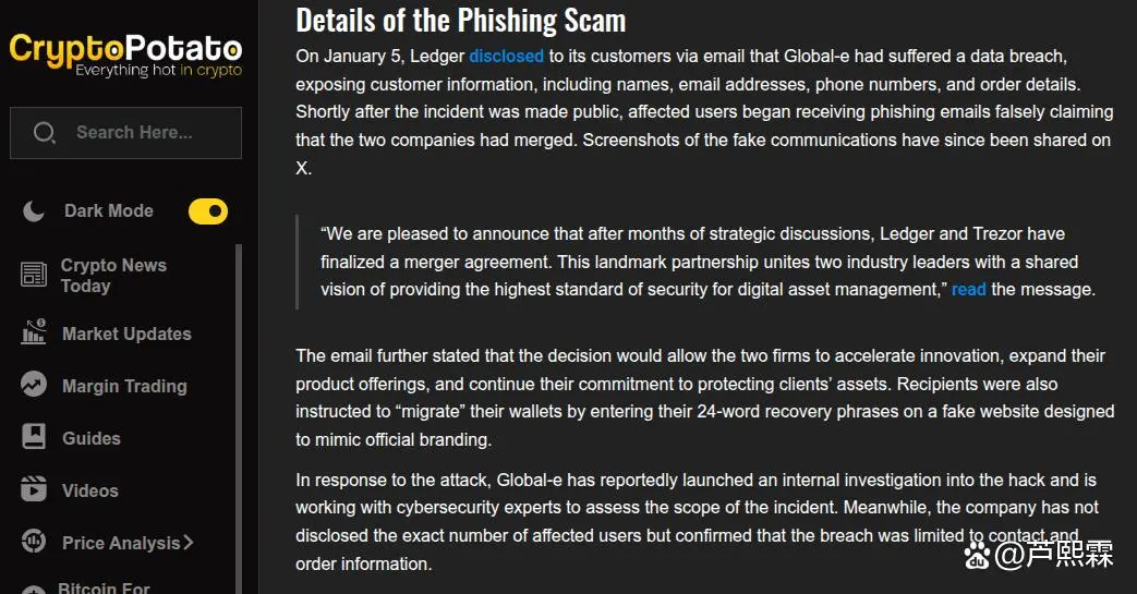 2024年初发生的Ledger与Global-e数据泄露事件标志着攻击范式的显著转变。攻击者并未直接攻破Ledger的硬件固件或Trezor的开源代码库,而是利用了第三方电商服务平台Global-e的安全缺陷,获取了大量真实用户的个人身份信息(PII)及交易记录。随后,攻击者利用这些高价值数据,发起了极具迷惑性的钓鱼攻击,谎称Ledger与竞争对手Trezor正在进行并购重组,要求用户进行“资产迁移”或“账户升级”。这种攻击方式不仅利用了用户对官方通知的天然信任,更通过嵌入真实的订单号、购买日期及设备型号等细节,极大地降低了用户的警惕性,导致大量用户在仿冒网站中输入了恢复助记词,造成资产实质性损失。